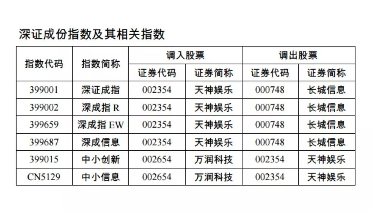 根據(jù)深圳證券交易所1月13日發(fā)布的《 關(guān)于調(diào)整深證成指等指數(shù)樣本股的公告》顯示,深交所決定于1月18日對(duì)深證成指、深證300等指數(shù)樣本股進(jìn)行調(diào)整,其中將天神娛樂(002354)調(diào)入深證