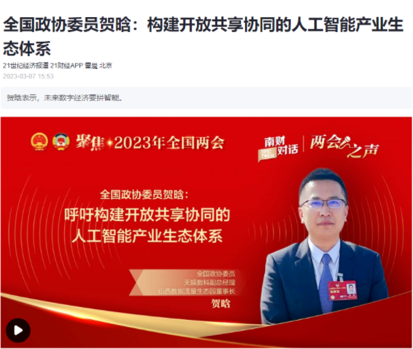新華社客戶端 | 全國(guó)兩會(huì)專題報(bào)道全國(guó)兩會(huì)已經(jīng)召開,第十四屆全國(guó)政協(xié)委員,天娛數(shù)科董事、副總經(jīng)理賀晗,針對(duì)我國(guó)人工智能產(chǎn)業(yè)生態(tài)體系的三大短板,提出要加快推動(dòng)數(shù)據(jù)要素高效流