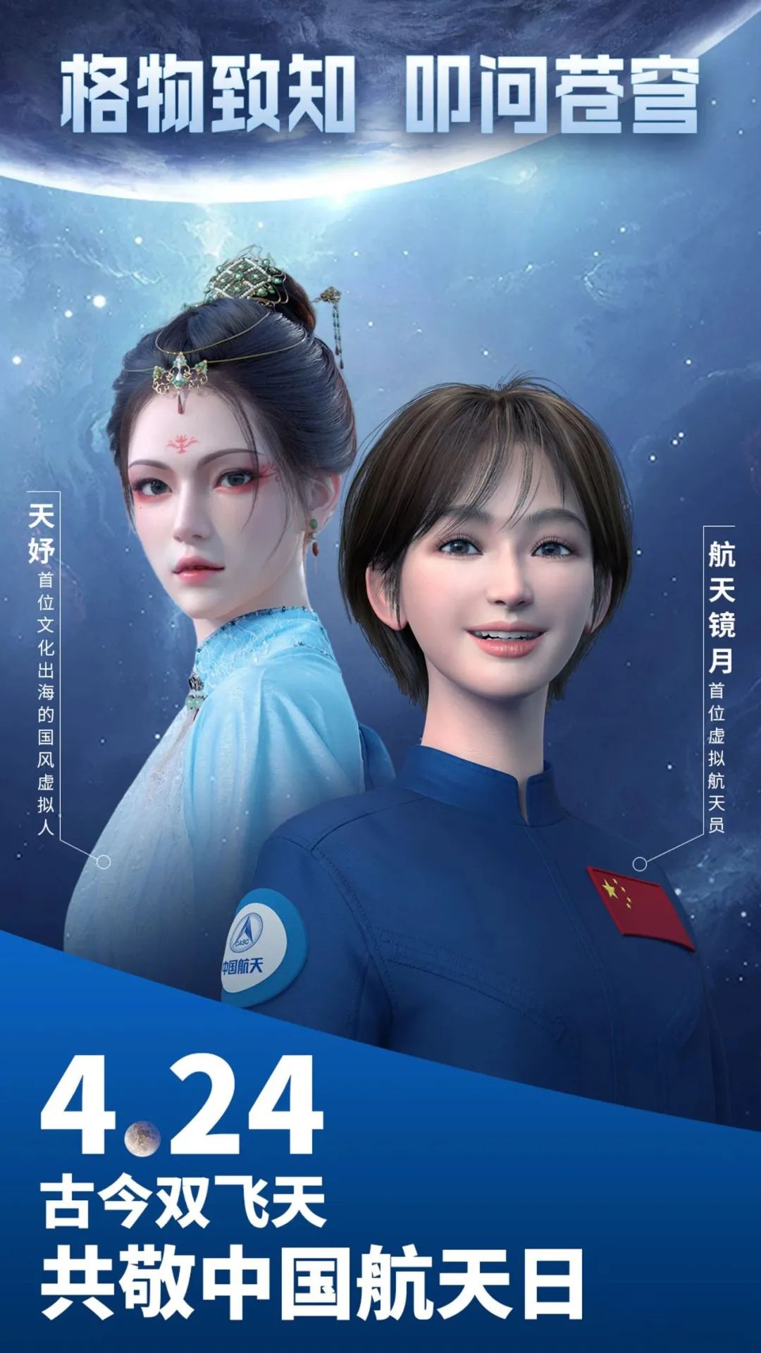 “格物致知,叩問(wèn)蒼穹”。4月24日,在第八個(gè)“中國(guó)航天日”來(lái)臨之際,天娛數(shù)科旗下虛擬數(shù)字人天妤攜手首位虛擬航天員鏡月發(fā)布雙人主題海報(bào),共同致敬中國(guó)航天日。二者以“古今雙飛