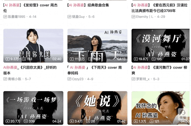 近日,AI“孫燕姿”爆火,其翻唱的《發(fā)如雪》《下雨天》短短幾天就突破百萬(wàn)播放量,一度登上各大平臺(tái)熱搜榜首位,成為“新晉頂流”。在B站在搜索框輸入“AI”后,第一個(gè)詞條就是“AI