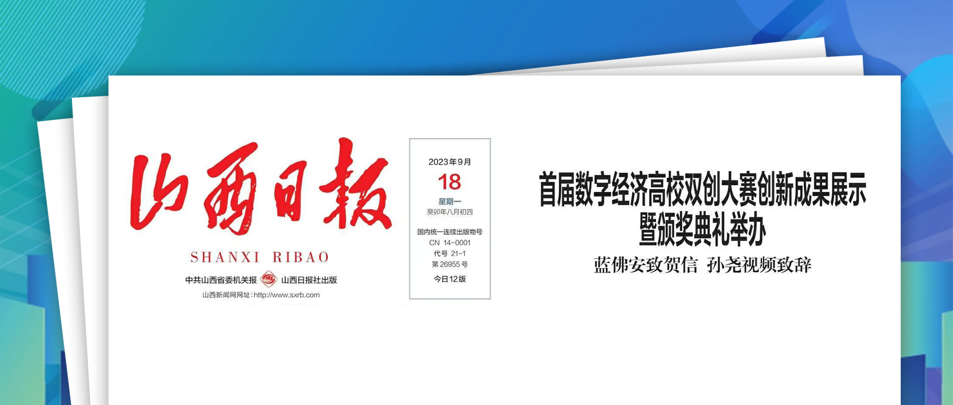 9月18日,《山西日?qǐng)?bào)》頭版發(fā)表文章《首屆數(shù)字經(jīng)濟(jì)高校雙創(chuàng)大賽創(chuàng)新成果展示暨頒獎(jiǎng)典禮舉辦》,報(bào)道了全國(guó)首個(gè)圍繞數(shù)字經(jīng)濟(jì)領(lǐng)域,面向高校學(xué)子的雙創(chuàng)大賽,人民網(wǎng)、光明網(wǎng)等多個(gè)權(quán)
