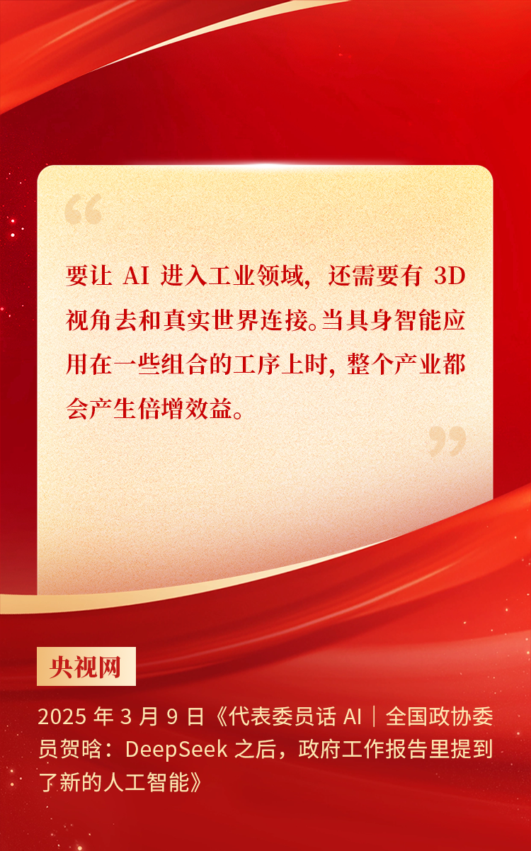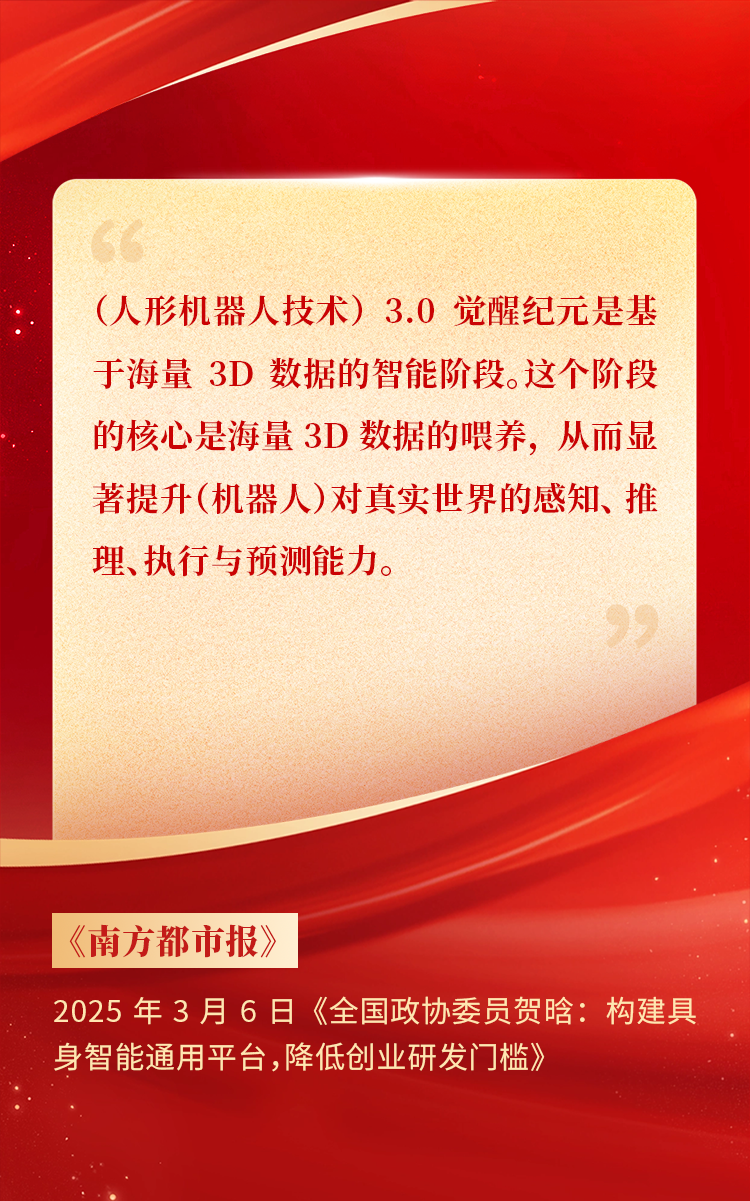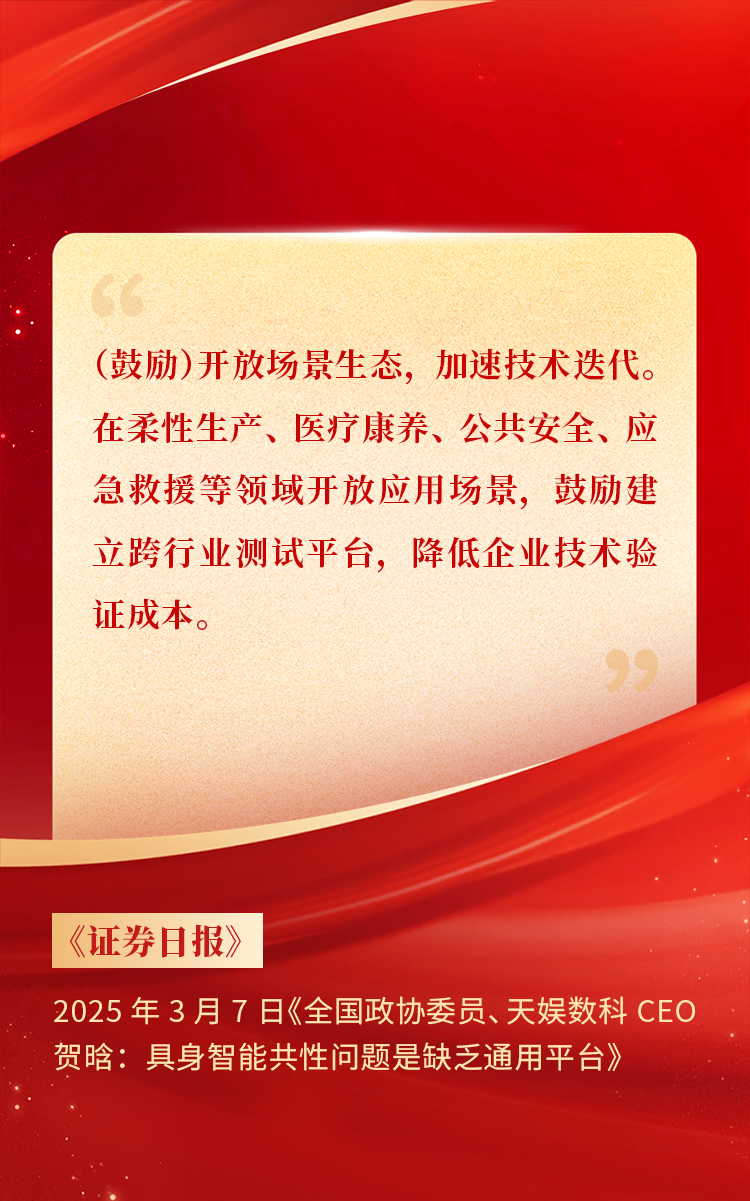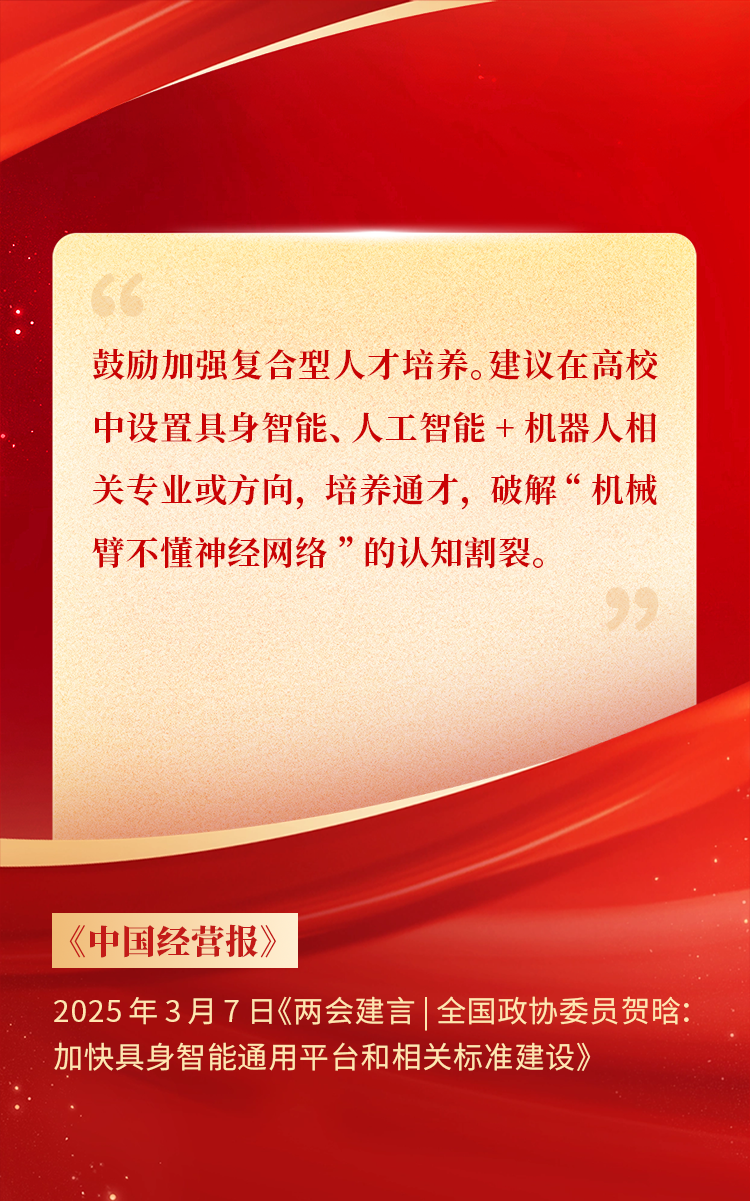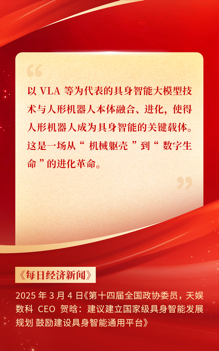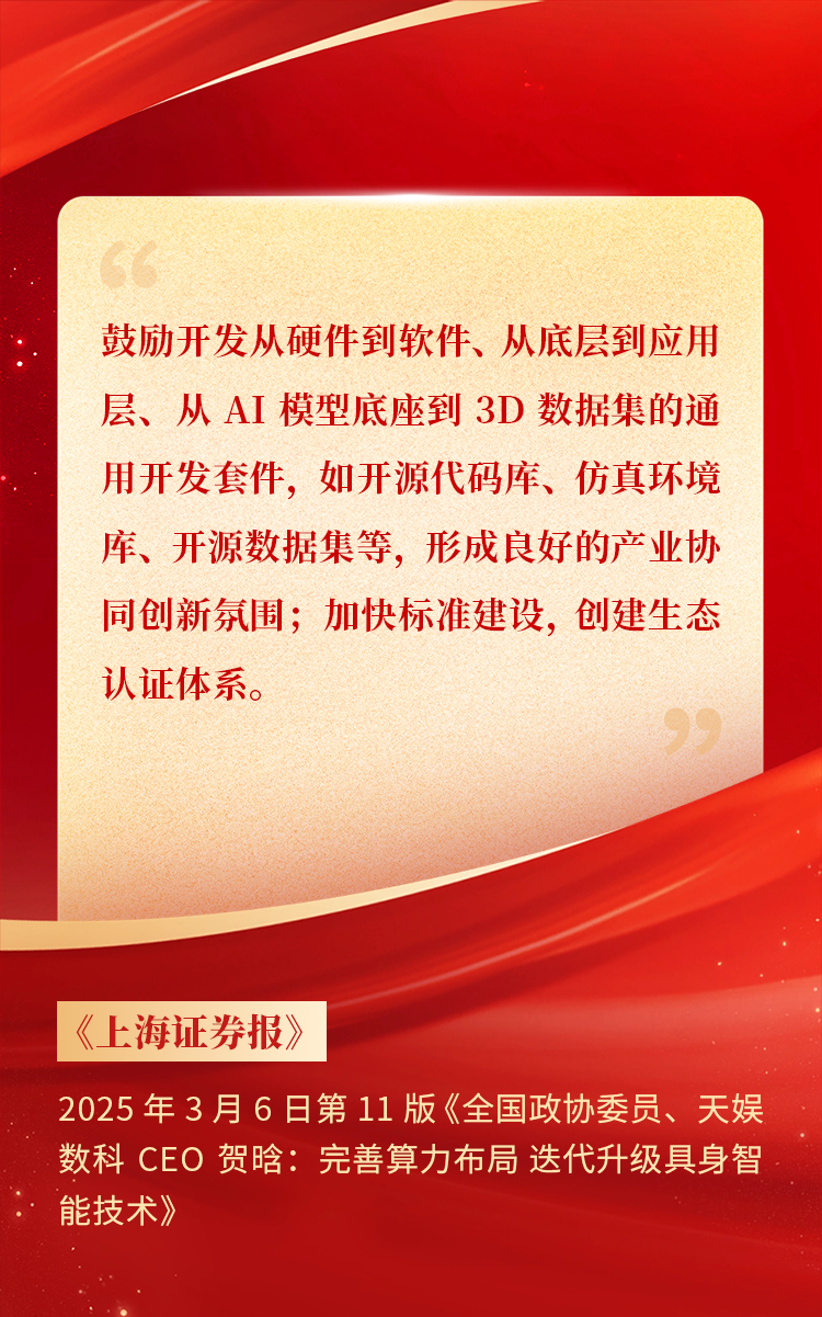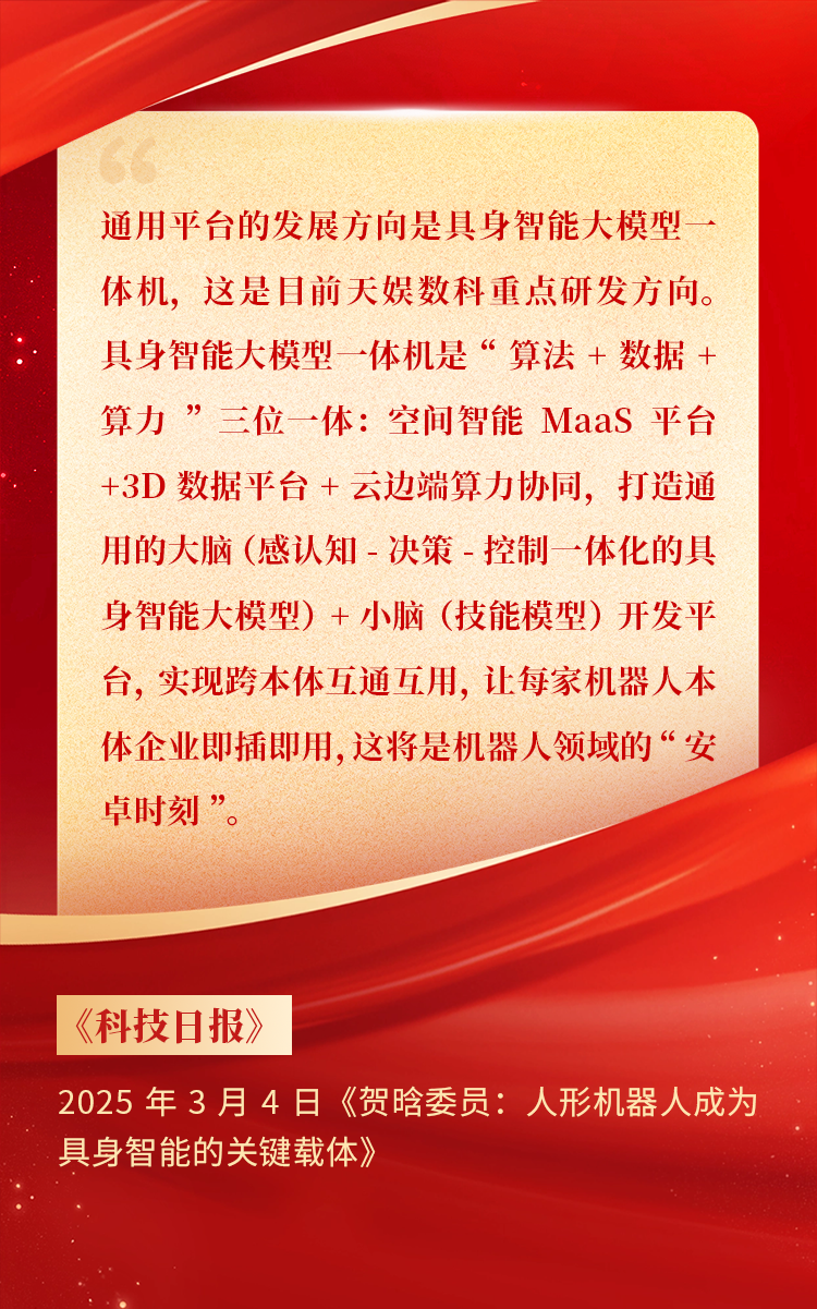 全國(guó)政協(xié)委員、天娛數(shù)科CEO賀晗連續(xù)第三年上會(huì)履職,圍繞“具身智能”“人形機(jī)器人”“人工智能產(chǎn)業(yè)”等熱詞積極建言,受到了媒體的廣泛關(guān)注,吸引了來(lái)自央視網(wǎng)、經(jīng)濟(jì)參考報(bào)、中國(guó)電子報(bào)、第一財(cái)經(jīng)日?qǐng)?bào)等央黨媒體、主流財(cái)經(jīng)等媒體記者的專(zhuān)訪報(bào)道,讓我們一起回顧賀晗委員兩會(huì)建言!