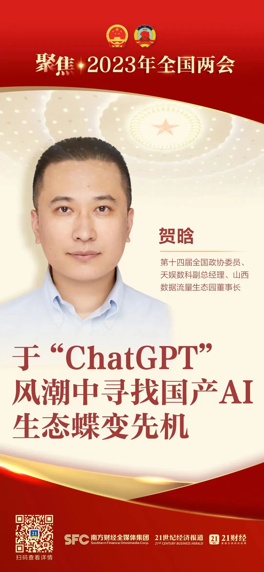 21世紀(jì)經(jīng)濟(jì)報(bào)道 兩會(huì)專題專訪報(bào)道2月13日,21世紀(jì)經(jīng)濟(jì)報(bào)道“聚焦 | 2023年兩會(huì)”專欄對(duì)第十四屆全國(guó)政協(xié)委員、天娛數(shù)科副總經(jīng)理賀晗進(jìn)行專訪。作為數(shù)字經(jīng)濟(jì)領(lǐng)域的委員,生于198